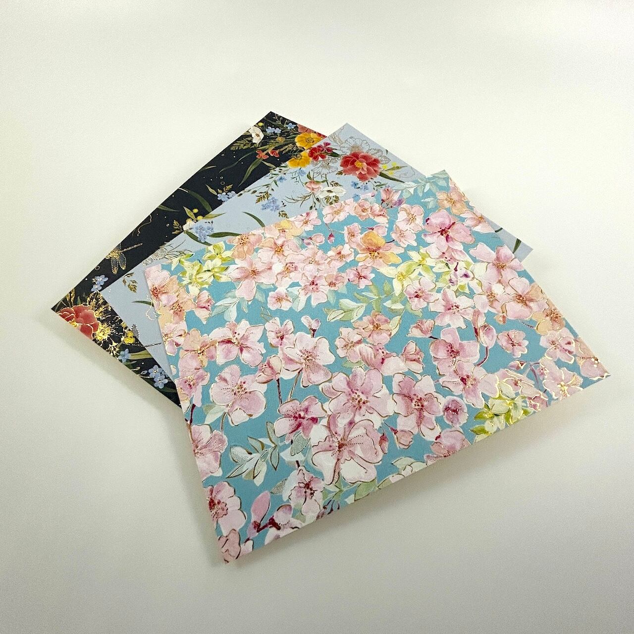 ゴールドとシルバーの箔押しにより、煌めきに満ちたフラワーモチーフ柄が出来上がりました。