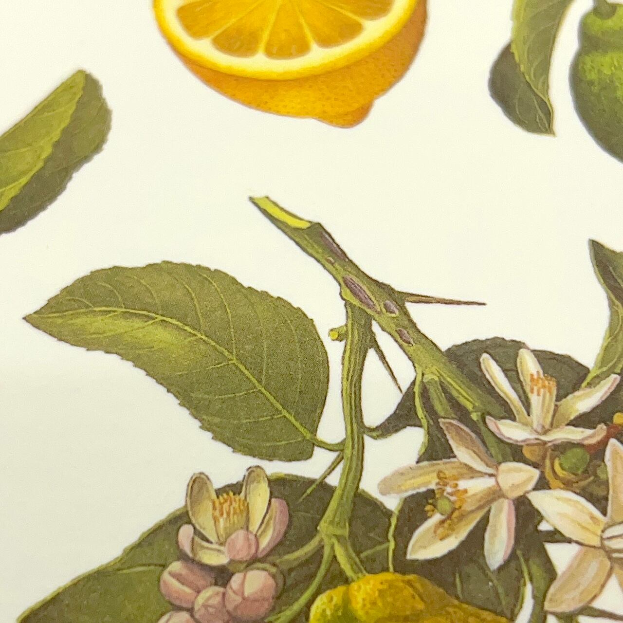 瑞々しいレモンと艶やかな葉を描いたボタニカル柄。陽だまりのような明るさと爽やかな香りを思わせる、清涼感あふれるデザインです。