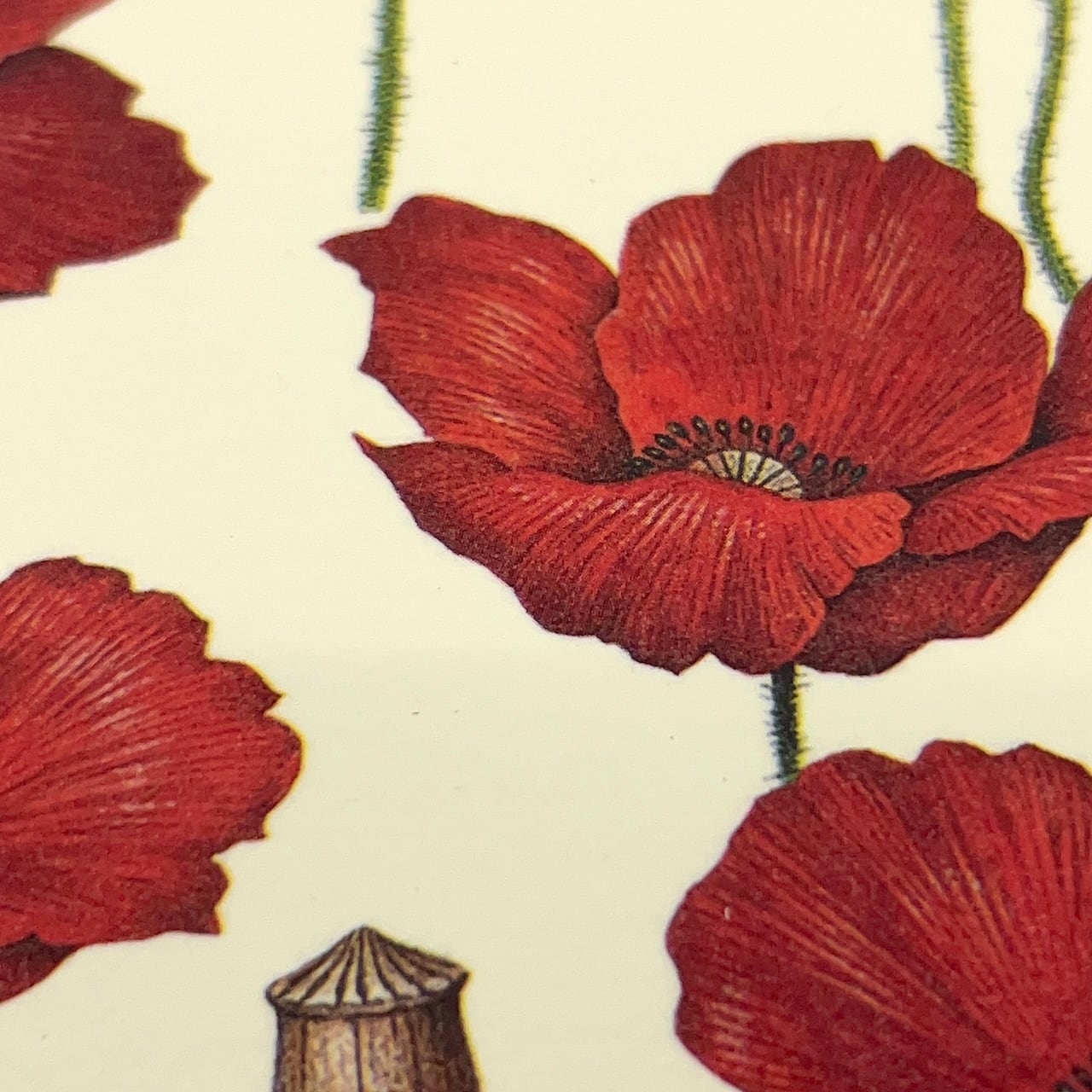 白地に咲く真紅のポピーが目を引くデザイン。凛とした佇まいと柔らかな色のコントラストが、上品で華やかな印象を与えます。