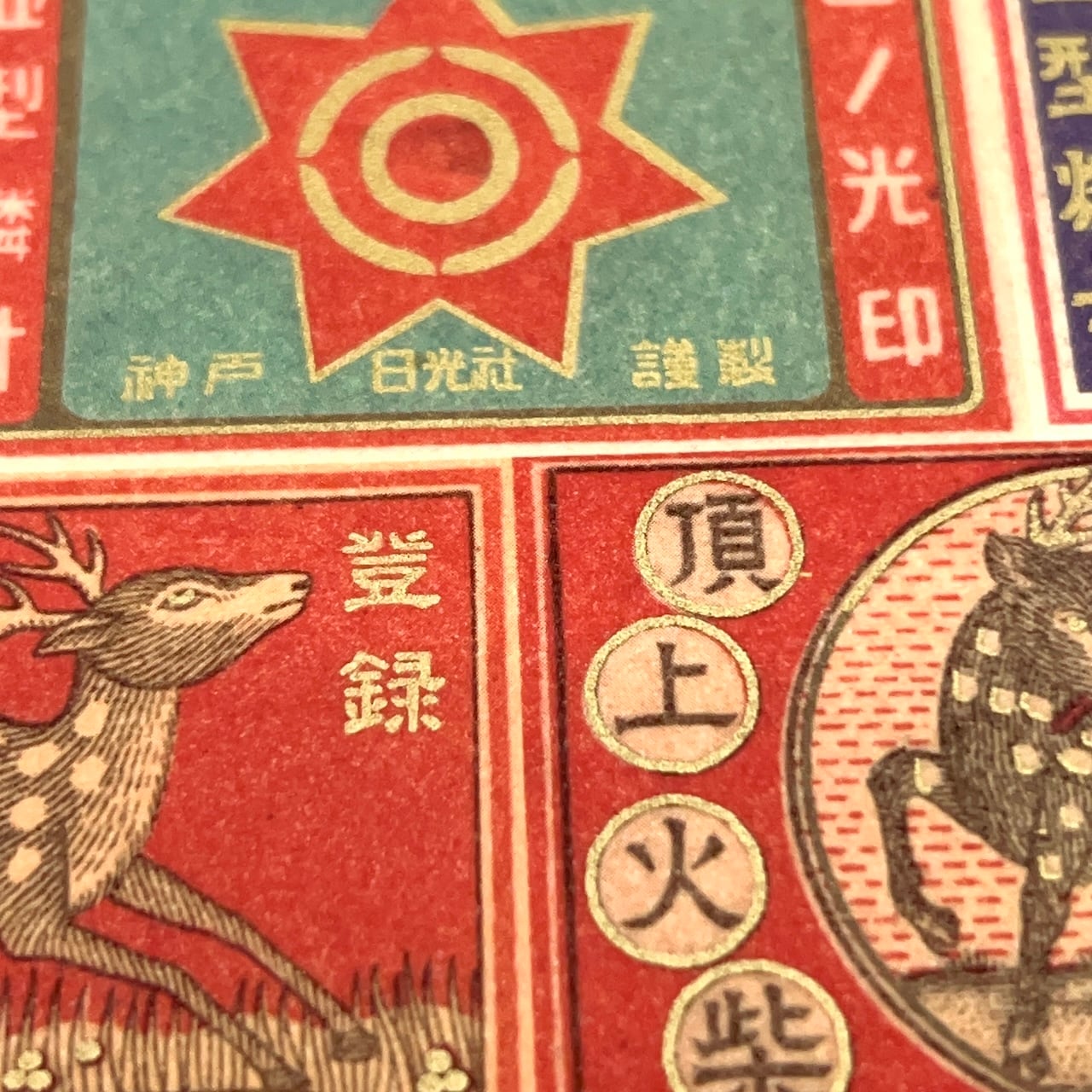 明治・大正時代のマッチ箱を思わせるデザイン。褪せた色合いと金粉印刷の風合いが美しく、クラシカルな魅力を放ちます。