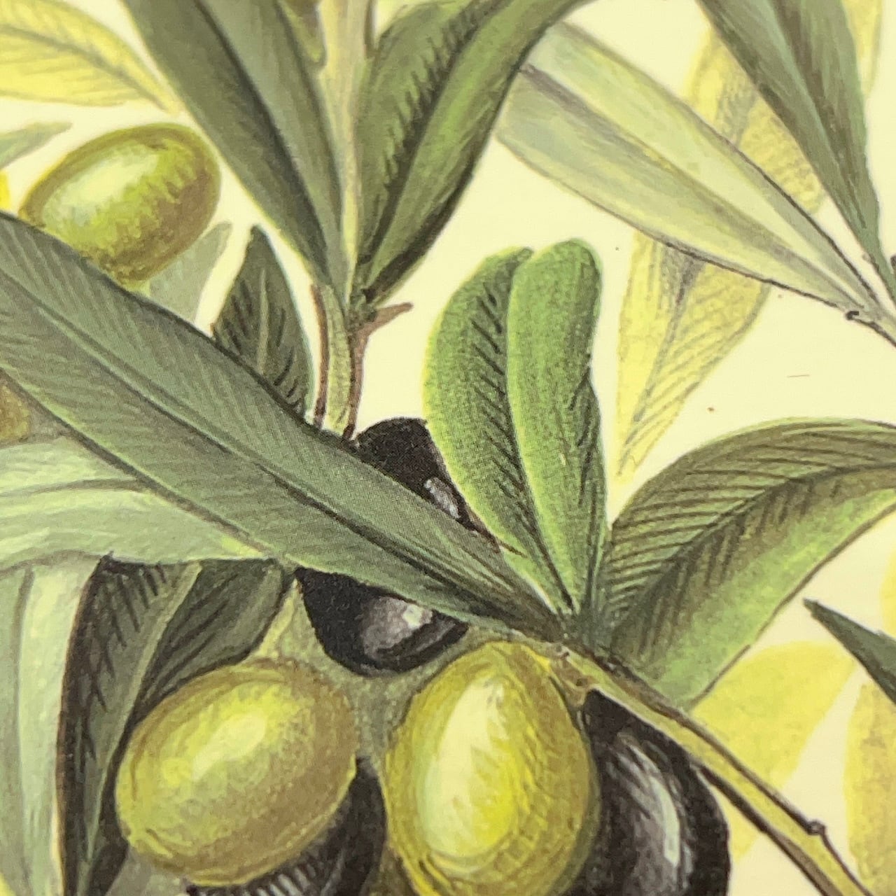 オリーブの枝葉と実を柔らかな筆致で描いたボタニカル柄。自然の息づかいを感じるような、穏やかで上質な落ち着きを演出します。