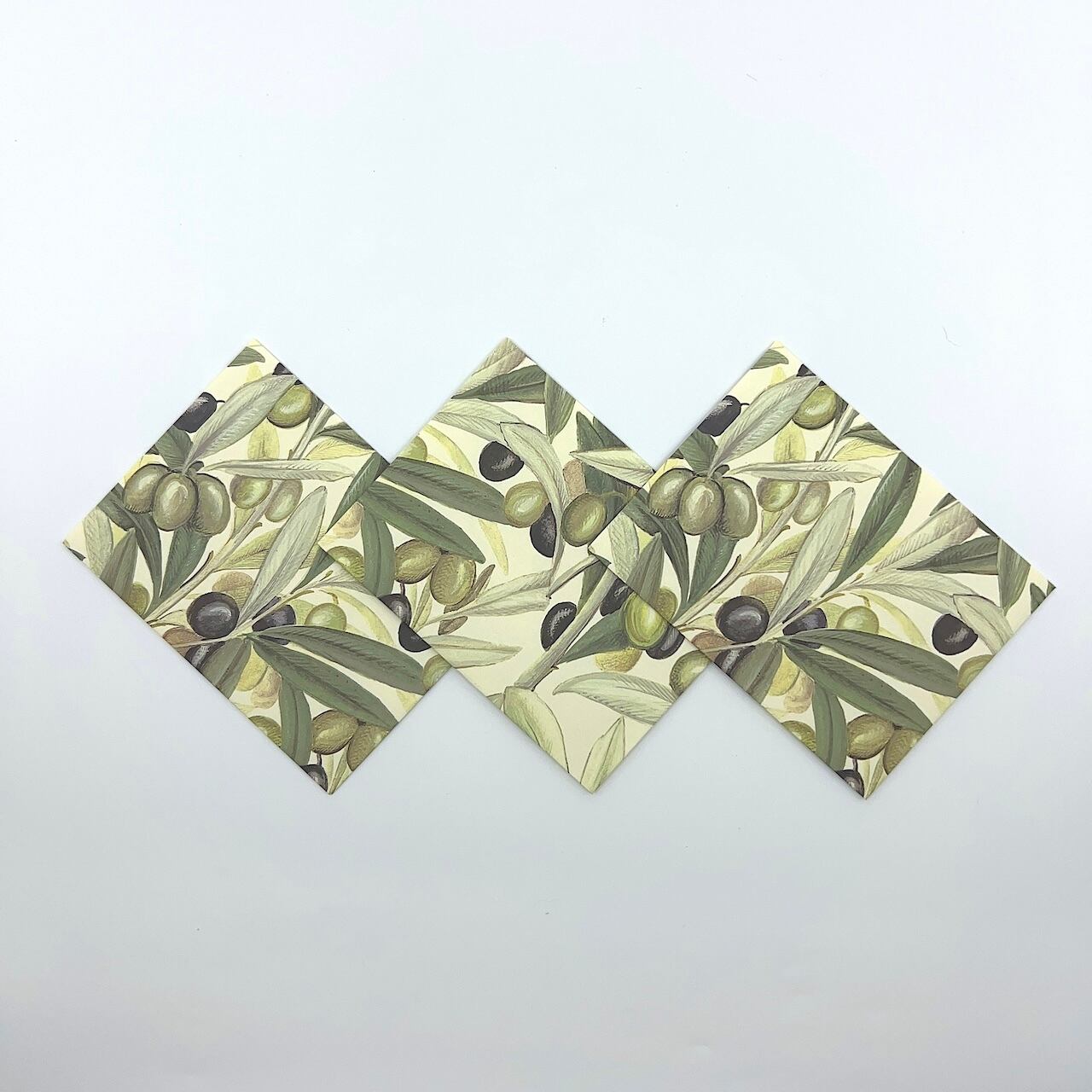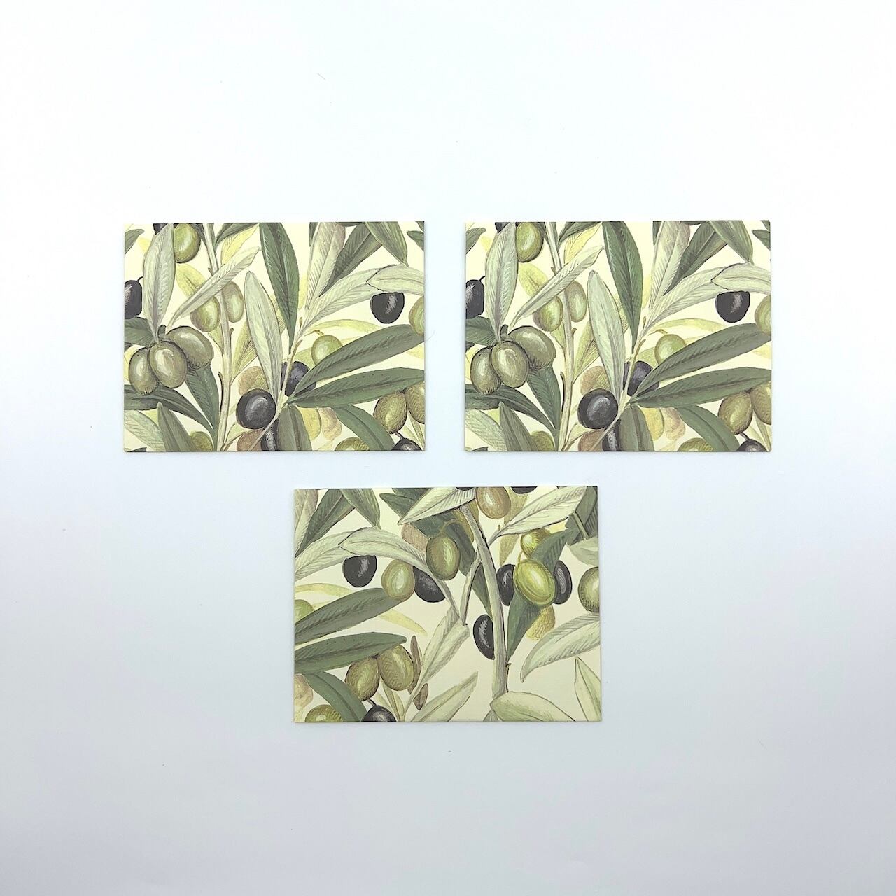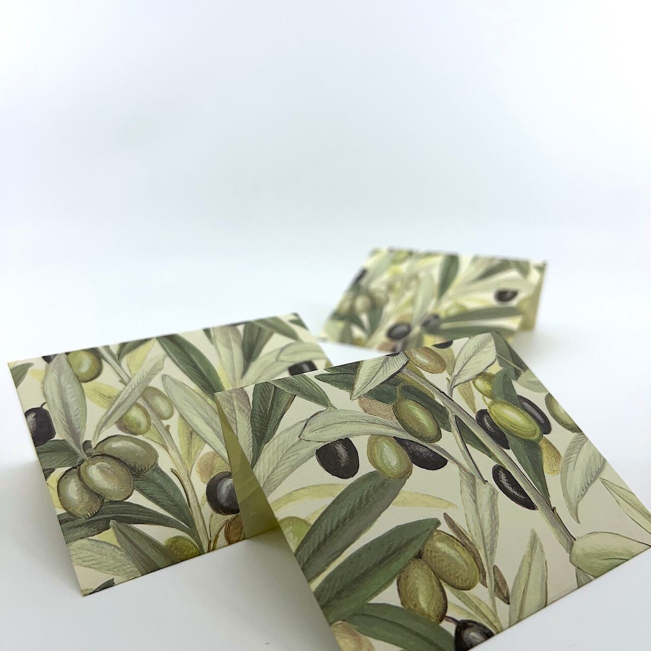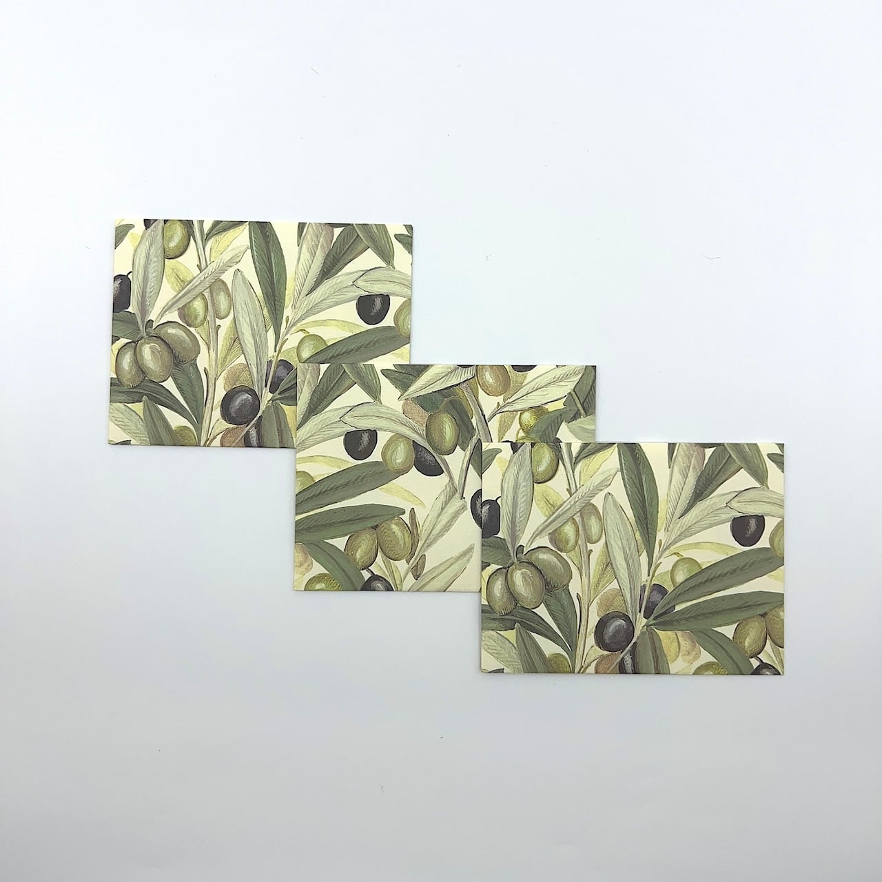 オリーブの枝葉と実を柔らかな筆致で描いたボタニカル柄。自然の息づかいを感じるような、穏やかで落ち着いたひと時を演出します。