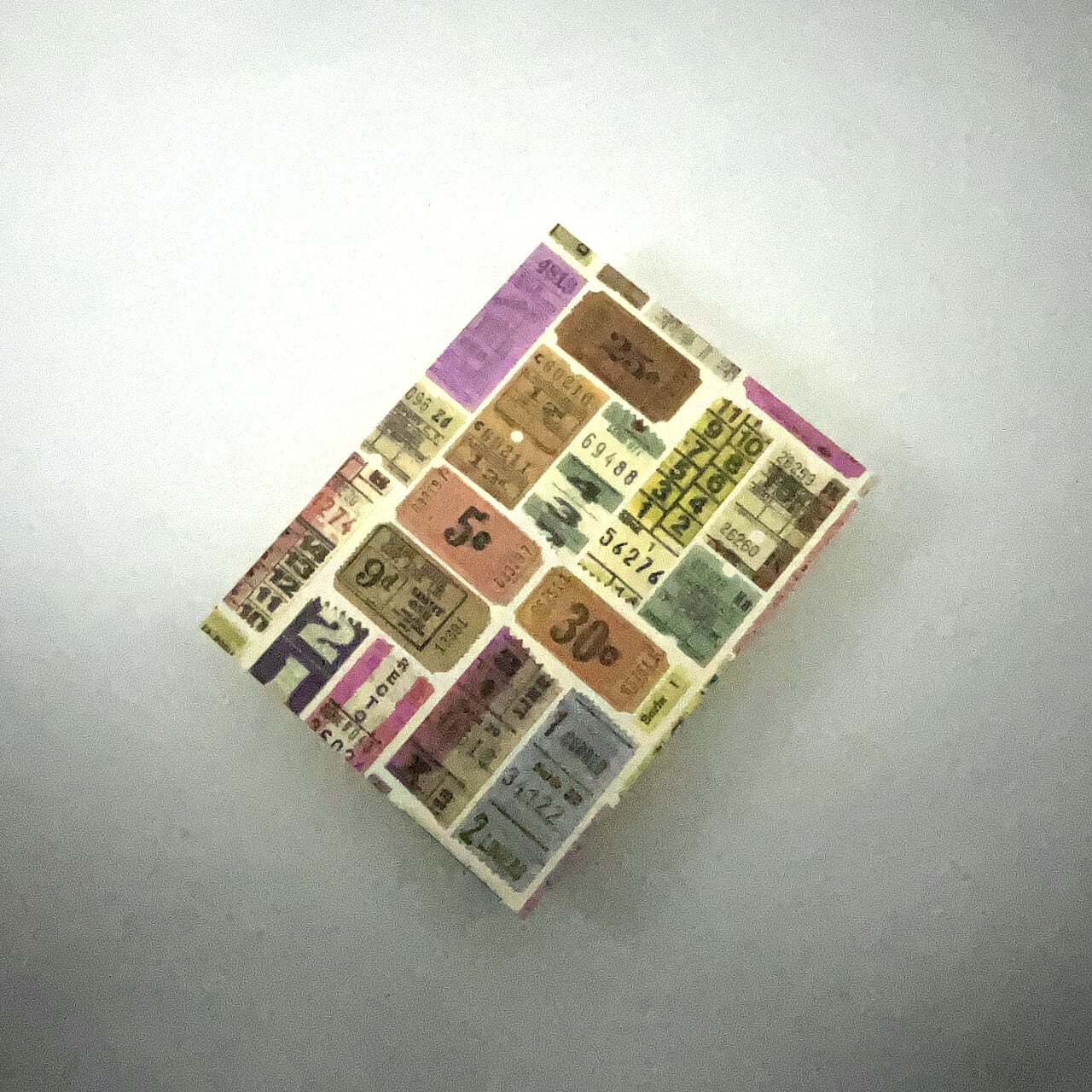 ベースのデザインペーパーはROSSI社製。ヴィンテージチケットをモチーフにしたレトロな柄。かすれた文字や色調が味わい深く、遠い昔の異国を思わせる雰囲気です。