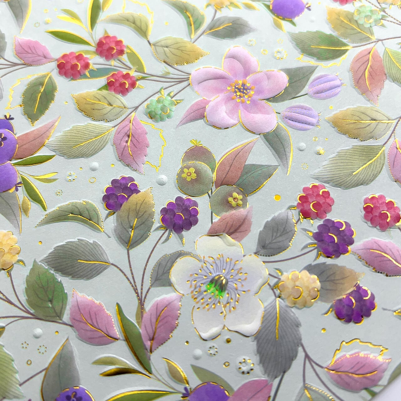 ベースのペーパーはデザイン集団のTURNOWSKY社。色鮮やかな花とベリーの果実。それぞれが立体的に浮かび上がるエンボス加工が施され、見て楽しむだけでなく、さわってなぞって、その存在感を楽しんで頂けます。