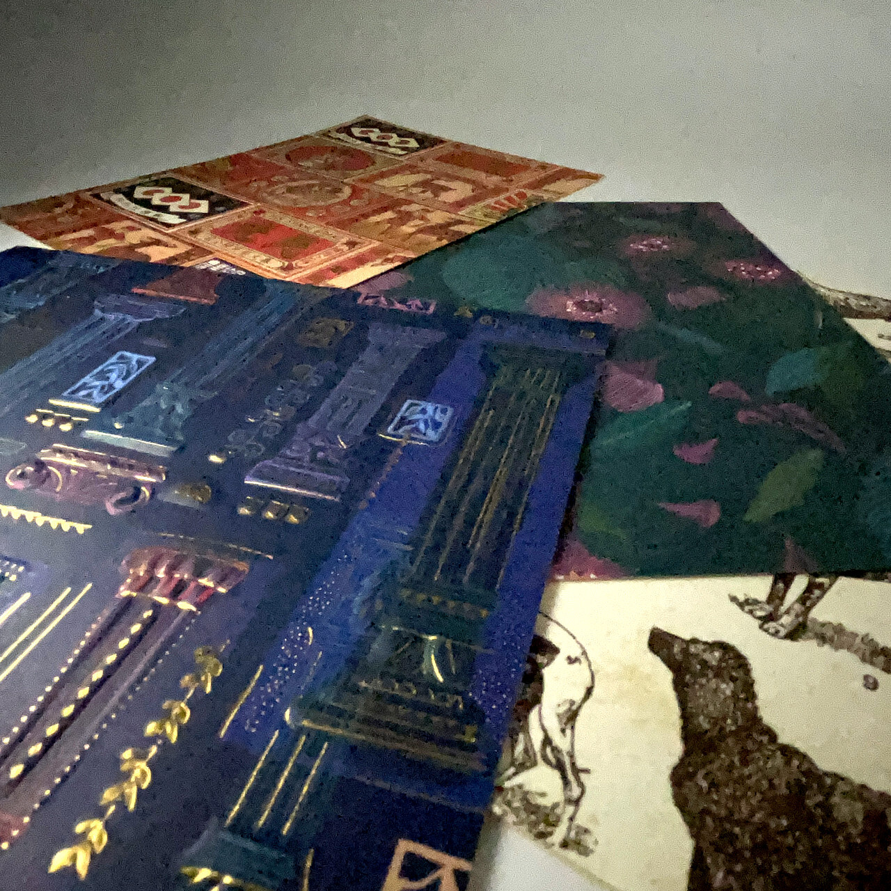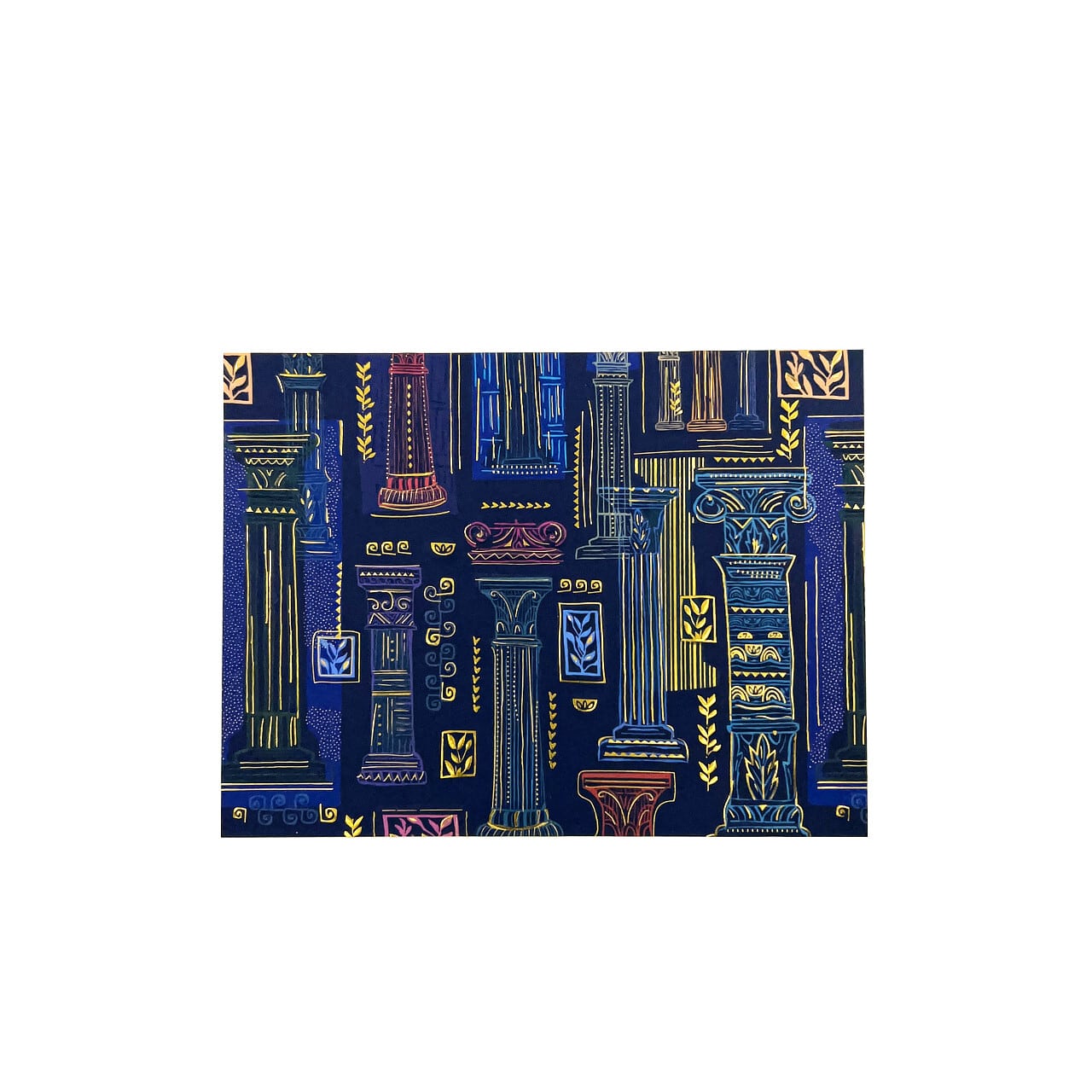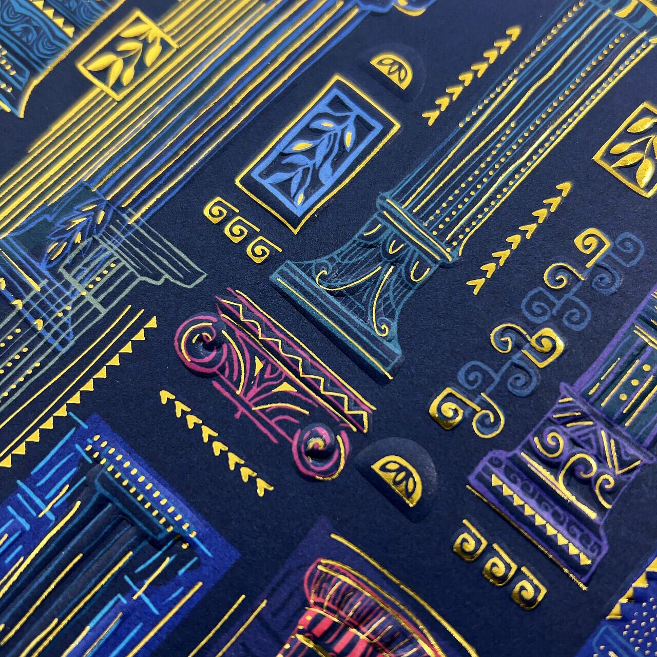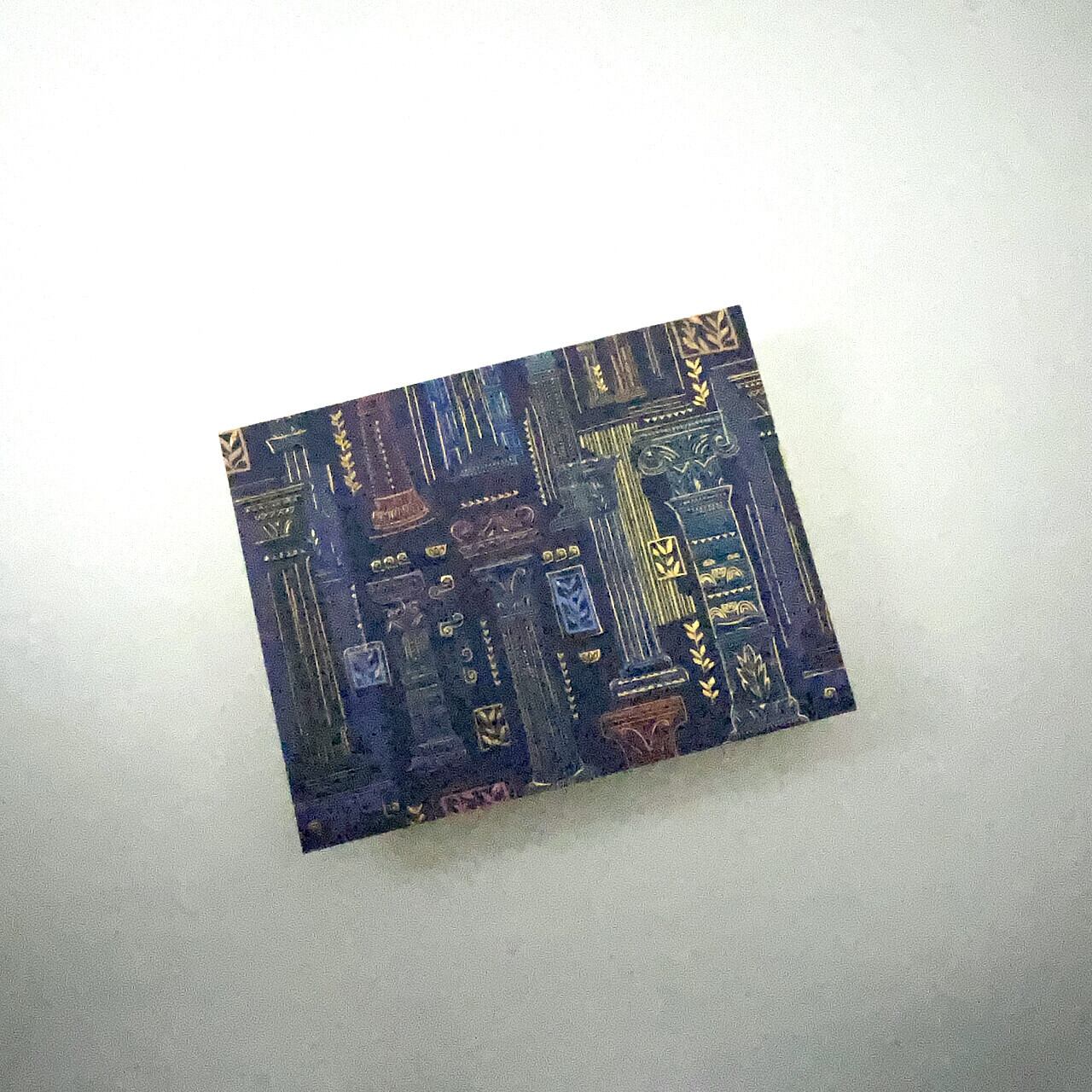 ベースのペーパーはデザイン集団のTURNOWSKY社。古代ギリシャや古代ローマを想起させるモチーフに、金色の箔押しを贅沢に施した存在感のある一枚。光によってきらきらと輝く様は紙であることを忘れてしまうほどです。